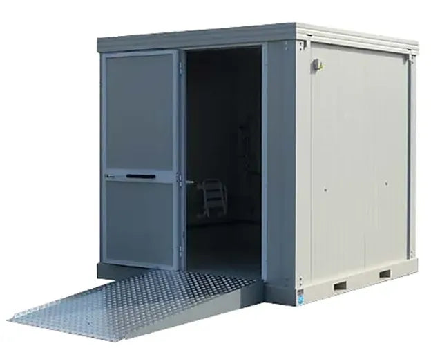 Our PMR-WC-Shower sanitary block is equipped with a switch, an LED ceiling light, a 1000 watt convector, a 50 liter electric water heater, an emergency block above the door, an electrical panel including a differential and circuit breakers (6 KW maximum) and an external connection box.